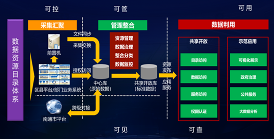在采集汇聚环节,重点考虑依托国家标准建立的数据目录体系,顺利获得前置机、接口调用、文件交换等多种方式,实现跨平台、跨网络的数据采集实施,同时要考虑与南通市平台的跨层级对接业务实现。