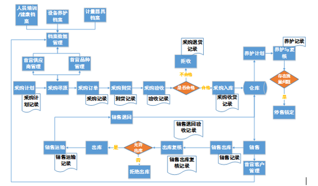 融合GSP管理,体现GSP管理监控下的对采购、购进验收、储存、销售及售后服务等环节管理。