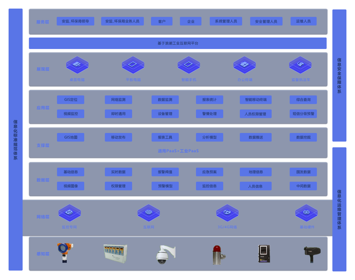 数据层:主要负责整个系统的数据采集以及存储,主要来源为现场设备采集 数据、国家发布数据、业务往来的数据等,为平台和应用形成强大的数据支撑 平台层:平台层分为IaaS层和PaaS层。IaaS层对外给予标准的符合OpenStack规范要求的REST API。对内在功能性、可靠性、安全性、支撑工具等方面全面优化开源 OpenStack,全面接入OpenStack各领域核心组件,给予完善的云基础设施服务能力,涵盖计算、存储、网络、安全等 IaaS服务,根据客户需求能够支持公有云、私有云和混合云三种不同应用模式。PaaS层:给予云计算、大数据、应用开发、中间件、人工智能、区块链等基础PaaS服务能力。顺利获得9001cc 以诚为本 9001cc企业大脑产品,面向各个行业和领域,给予以数据为核心的工业数据服务、机理模型服务和业务微服务,此外还给予了面向工业设备连接的物联网服务、云化软件和APP开发服务及基于区块链技术构建的云资源管理库 应用层:顺利获得平台的搭建,主要面向石油、化工、冶金等不同行业的不同业务流程,给予GIS定位、数据监测、警情处理、设备管理等相关的应用,为相关人员随时随地关注安全状况和污染情况,对企业全方面的有效管理