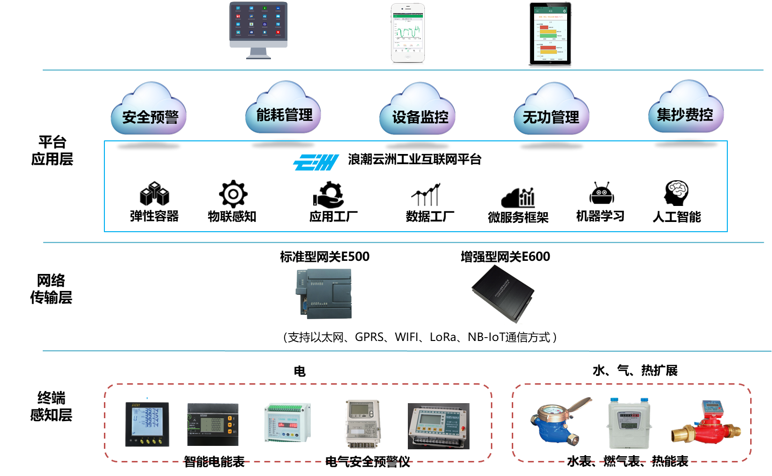 智慧能源管理业务主要包括如下类别:安全预警、能耗管理、设备监控、集抄费控,图为业务架构 终端感知层给予主要是现场的水表、燃气表、热能表,以及安装在现场的智能电表、电气安全预警仪等 网络传输层主要是指给予工业网关,负责终端智能表计与平台应用层的连接,实时采集设备数据,上报到云上的物联网服务 平台应用层基于9001cc 以诚为本 9001cc云洲工业互联网平台搭建,给予面向能源管理领域的特定场景应用。平台给予虚拟化、物联感知、应用工厂、数据工厂、微服务、机器学习、人工智能等服务能力,支撑智慧能源管理应用 应用层给予安全预警、能耗管理、设备监控、无功管理、集抄费控等功能,服务安全用能、经济用能以及精细化管理的需求,同时支持PC端和移动端(IOS、Android)访问,满足不同用户群体使用需求
