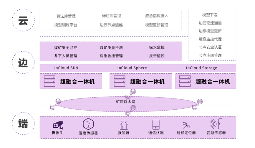 该解决方案重点采用了中心云+矿点“边缘云”模式,顺利获得整合煤矿现有应用系统,规范数据传输标准以及采集企业重要信息,向下延伸涉及生产设备监控、井下人员定位、事故风险预警等一系列应用,顺利获得实时的边缘计算完成本地视频分析,AI辅助决策等及时发现并处理影响煤矿安全生产的潜在风险;向上推进与集团公司、煤监局的联网工作,实现与省级煤监总局的事故风险平台的无缝对接,明确安全生产责任落实到企业各个具体层级、部门与人员,强化了安全生产标准化建设。